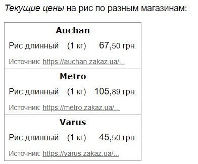 Звичайний довгий рис з 2 листопада до 2 грудня піднявся в ціні на 4,13 гривні. Його середня вартість становить 72,9 гривні за кілограм. Щодо вартості в супермаркетах, то вона коливається від 45 грн/кг до 105 грн/кг.