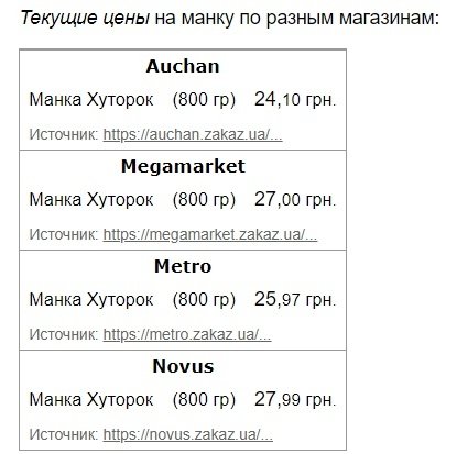 Манка подешевшала за місяць на 72 копійки та коштує в середньому 26,2 гривні за 800 грамів. У супермаркетах її вартість варіюється від 24 грн/кг до 27 грн/кг.