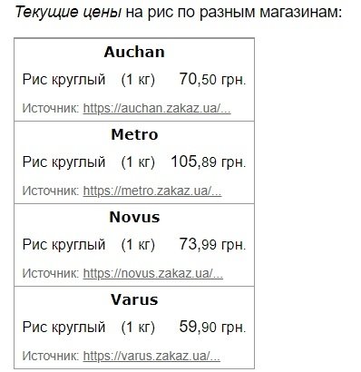 Рис круглий за минулий місяць, з 2 листопада, в середньому подорожчав на 6,91 гривні і зараз коштує близько 77,5 гривень за кілограм. А у супермаркетах ціни на цю крупу коливаються від 59 грн/кг до 100 грн/кг.